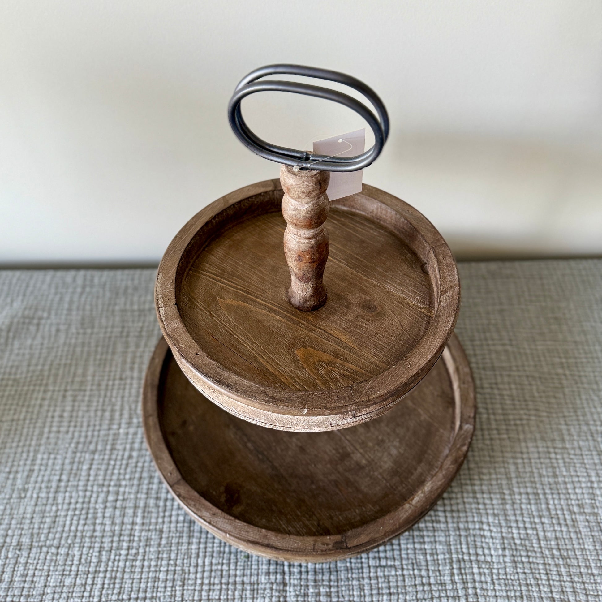 Elevate your countertop organization or centerpiece display with this charming wood two-tiered stand. Crafted from solid wood with a weathered finish, this piece blends rustic elegance with everyday functionality. The sturdy metal handle adds a vintage touch while making it easy to carry and reposition.